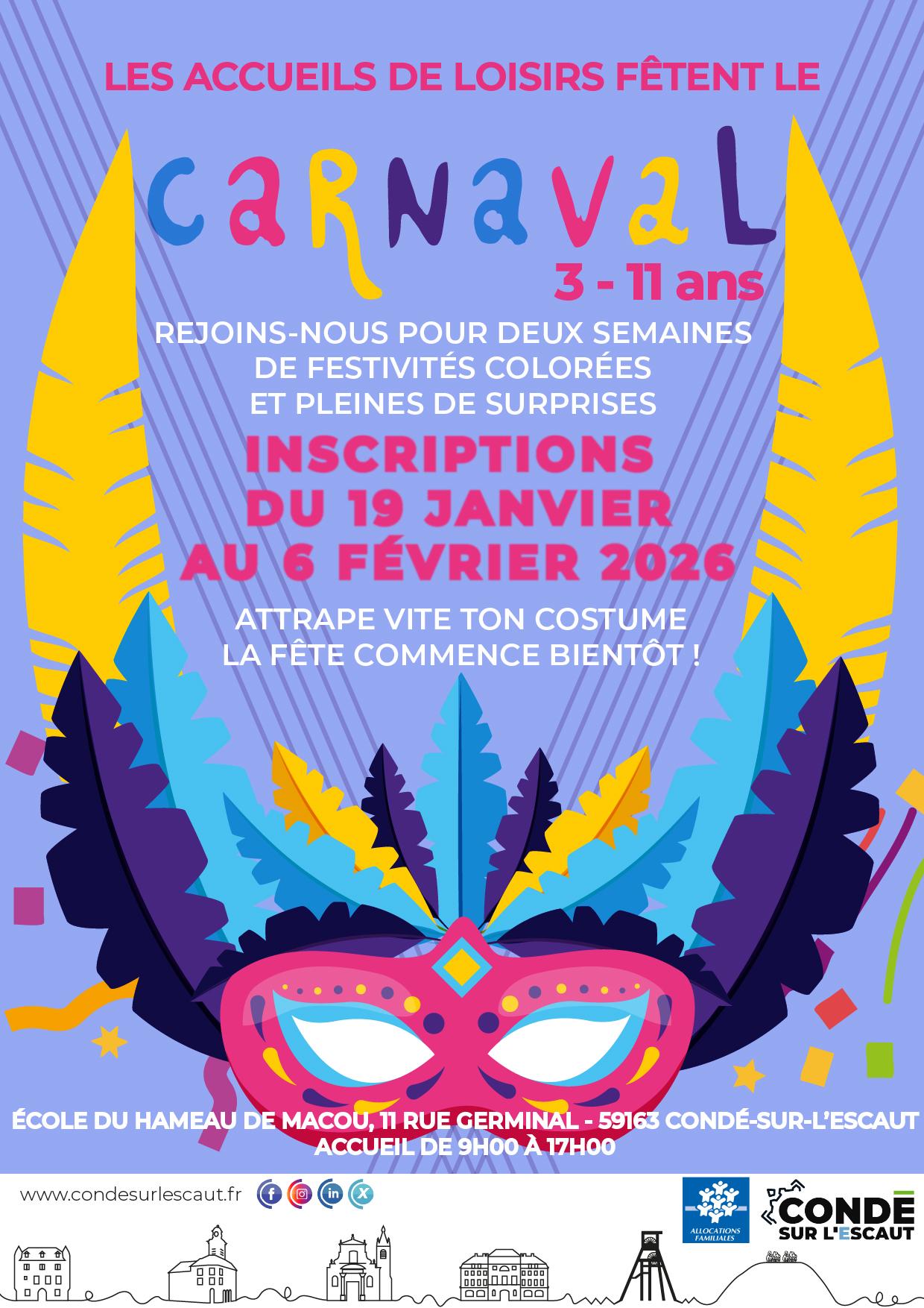 À l'occasion des prochaines vacances scolaires, le Pôle Éducation Jeunesse et Sport organise les accueils de loisirs autour du thème du Carnaval. Les activités se dérouleront du lundi 16 au vendredi 27 février 2026.